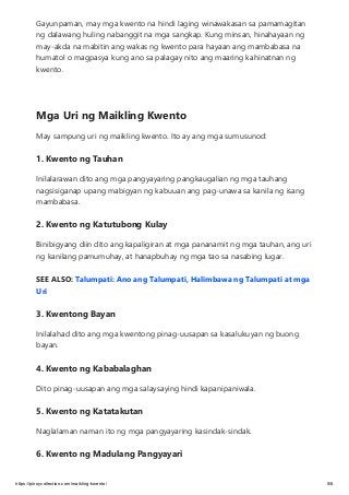 Kuwentong Katutubong Kulay - binibigyang-diin ang kapaligiran at mga pananamit ng mga tauhan ang uri ng pamumuhay at hanapbuhay ng mga. Ito ang pinaka-kaluluwa ng maikling kwento. Tinatawag ding maikling katha ang maikling kwento.