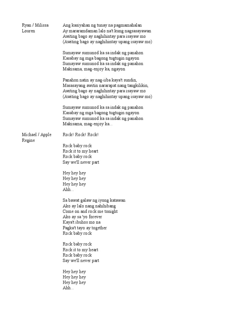 I just want to share it The lyrics of these compositions were different from the original lyrics of famous songs. Sana ay di na magwakas itong awit ng pag-ibig. Ang isang pag-ibig Ay parang lansangan Na pang dalawahan Kayat sa ating awit Tayo ay magbigayan.